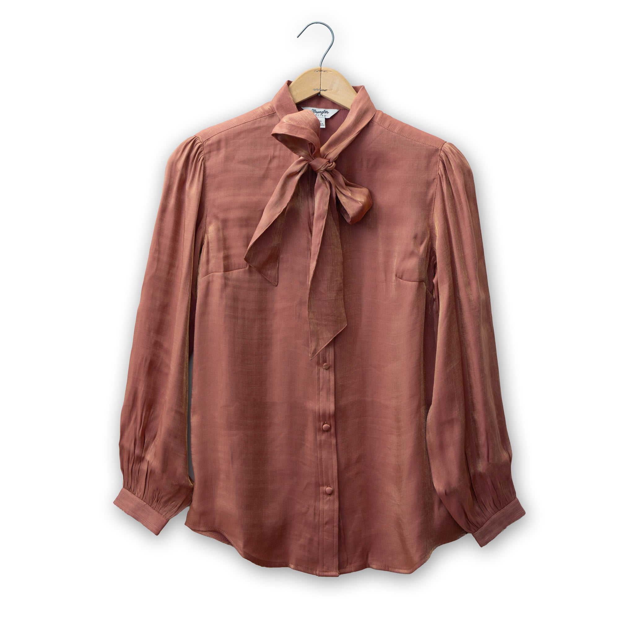 Bring some extra razzle-dazzle to any occasion with our Women's Shimmer Tie Neck Blouse. It’s crafted from a lightweight and ultra-soft fabric blend, with a glimmering rose gold color that will instantly elevate any outfit. Don’t worry—the cowgirl flair’s there with a Western back yoke, a full button front, and a neck tie you can wear in a ladylike bow or leave long and loose. Tuck it in, leave it untucked, this top will steal the show either way.