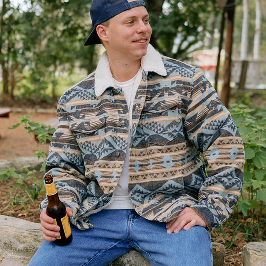 This sherpa-lined trucker jacket is a time-tested staple that comes with all the authentic Western styling you know and love about Wrangler jackets, including flap front pockets with 'W' stitching and snaps as well as side-hand pockets, a button front, and a cozy sherpa lining and quilted lined sleeves to keep you toasty. It's crafted from a blend of wool and strong fibers to guarantee long-term durability. Plus, it features a southwestern-inspired geometric woven print. It's perfect for fall, winter, and transitioning between the seasons.